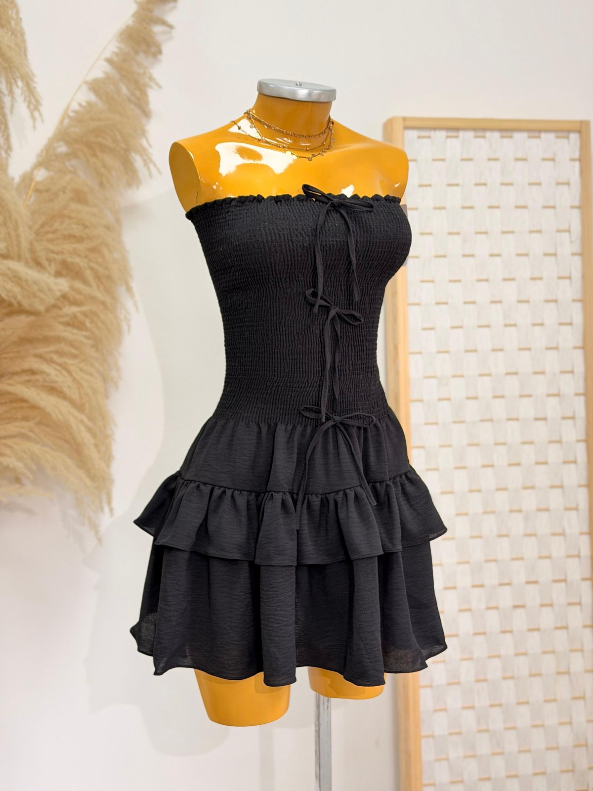 Tela Satín de acabado suave y sutil brillo con tiras finas y escote recto.