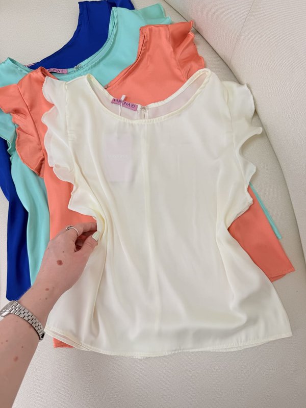 Top halter con frunce y corte peplum, tela rayón fresca y suave.