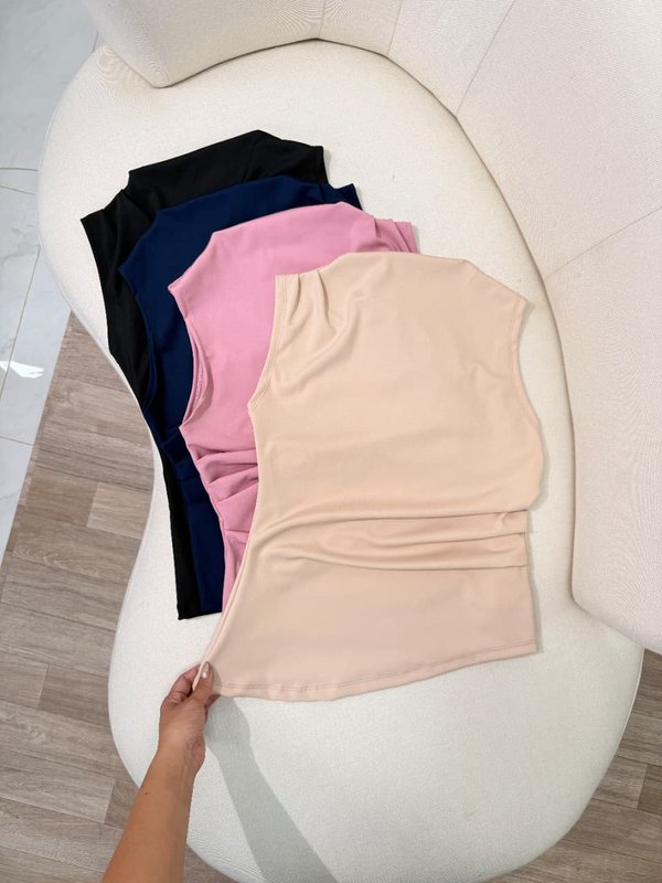 Top halter con frunce y corte peplum, tela rayón fresca y suave.